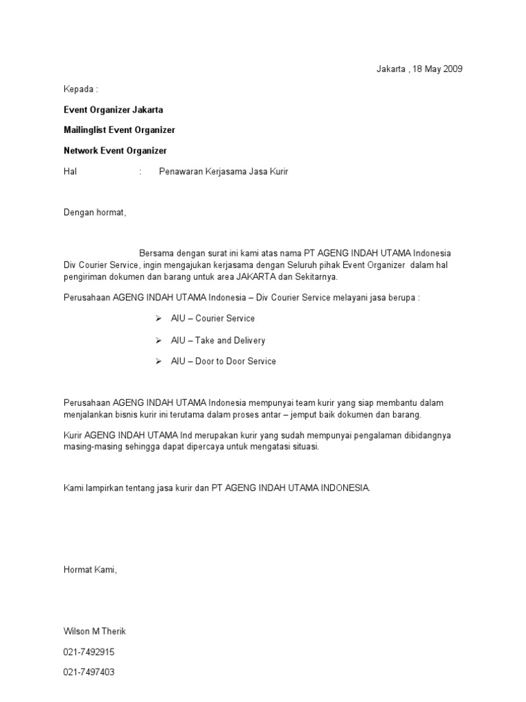 Contoh Surat Penawaran Kerjasama Bentuk Semi Block Style Contoh Seputar Surat from lh5.googleusercontent.com Kerangka surat bisnis bahasa inggris spreading the message of love. Secara umum struktur dan format penulisannya. Pada kesempatan kali ini kami akan memberikan contoh contoh surat pribadi atau yang dalam bahasa inggrisnya personal letter. Maka surat ini berfungsi sebagai penawaran barang maupun jasa. Surat ini merupakan surat penawaran kerjasama bisnis dalam bahasa inggris. Contoh surat penawaran dalam bahasa inggris. Contoh surat penawaran produk dalam bahasa inggris. 13 contoh surat penawaran lengkap jasa kerjasama barang elektronik.